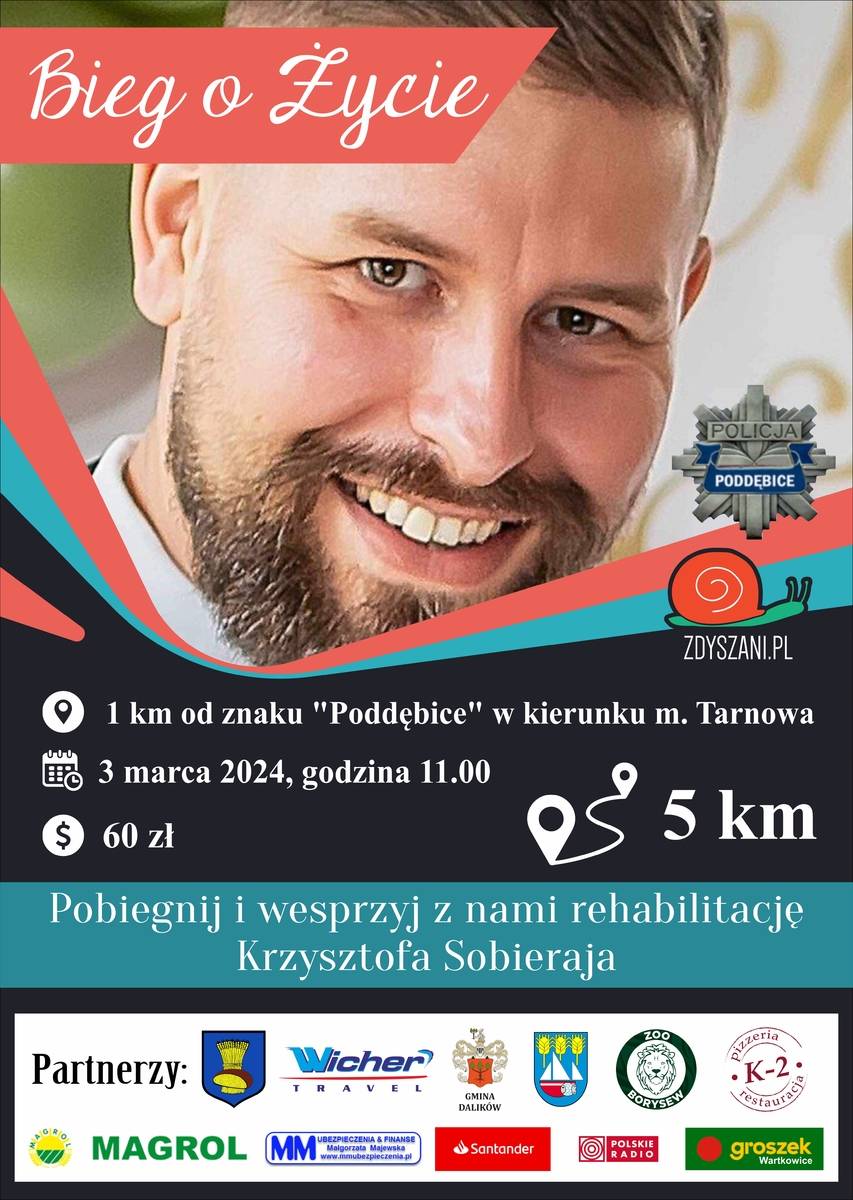 Bieg o Życie to wyjątkowa inicjatywa, w której wszyscy zawodnicy czują się zwycięzcami, a każdy jego uczestnik może pomagać. Zebrane środki pochodzące z opłaty wpisowej zostaną przeznaczone na pokrycie kosztów rehabilitacji funkcjonariusza Komendy Powiatowej Policji w Poddębicach młodszego aspiranta Krzysztofa Sobieraja, który podczas pełnionej służby, wskutek potrącenia przez kierującego doznał bardzo poważnych obrażeń.