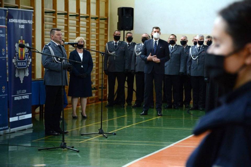 Nowo przyjętych policjantów osobiście powitał w szeregach formacji I Zastępca Komendant Wojewódzkiego Policji w Łodzi insp. Tomasz Olczyk, który w krótkim przemówieniu podkreślił znaczenie i rolę Policji w społeczeństwie. Pogratulował policjantom wyboru tak odpowiedzialnej służby, z którą człowiek wiąże się zwykle na całe życie.