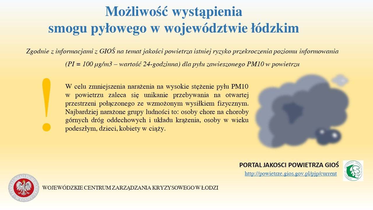 Wojewódzkie Centrum Zarządzania Kryzysowego Łódzkiego Urzędu Wojewódzkiego w Łodzi ostrzega przed smogiem w całym Łódzkiem. Alert przed niebezpiecznym wzrostem pyłów zawieszonych PM 10 w powietrzu obowiązuje aż do poniedziałku, 15 listopada do godziny 24.00. Szczególną ostrożnością w związku z ostrzeżeniem powinni wykazać się seniorzy, dzieci oraz osoby schorowane. Szczegóły poniżej!