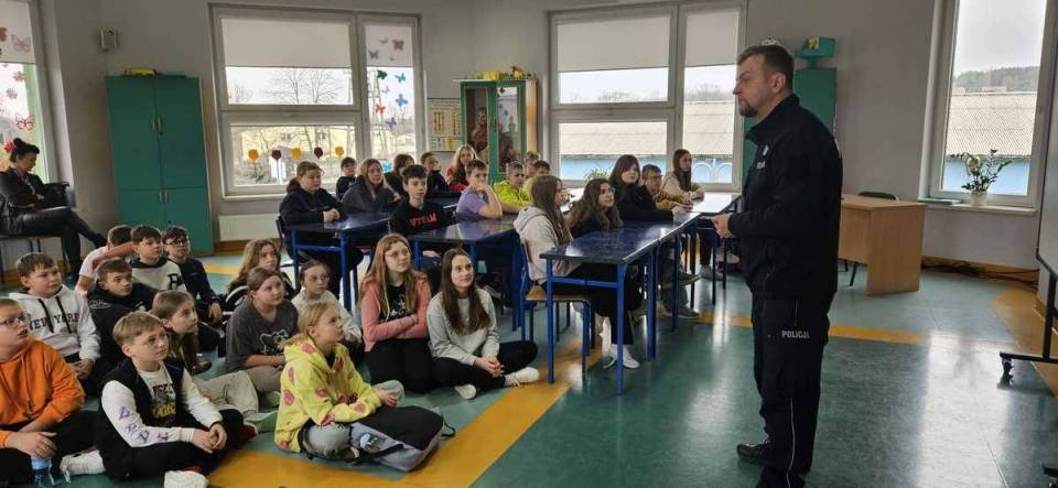 Policjant z Zespołu do spraw Nieletnich i Patologii 21 lutego odwiedził uczniów ze Szkoły Podstawowej w Działoszynie. Głównym tematem spotkania była przemoc rówieśnicza, niewłaściwe zachowania w szkole i poza nią. Dużo uwagi poświęcono uświadamianiu czym jest hejt, który w życiu młodego człowieka przede wszystkim przybiera formy agresywnych i nienawistnych komentarzy, wyzwisk, przekleństw, obelg, gróźb wypisywanych na internetowych forach.