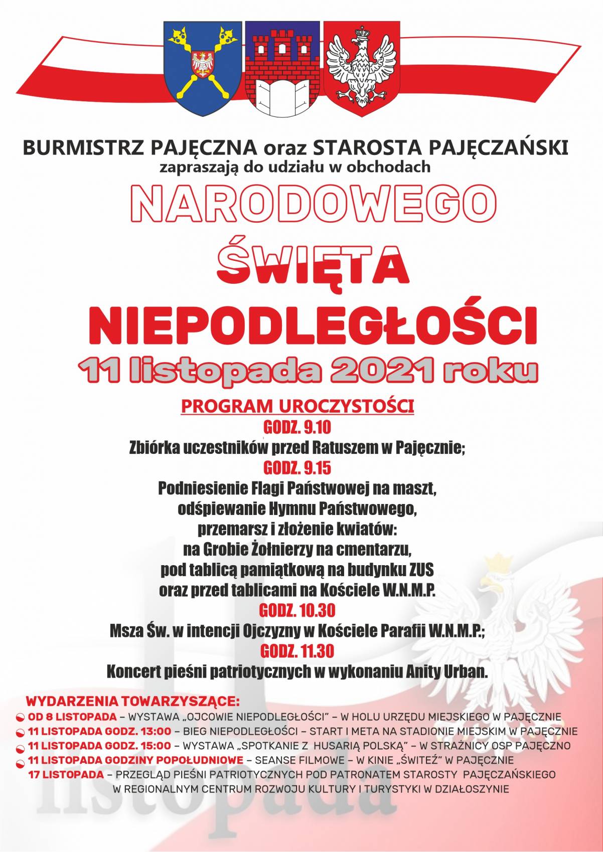 Samorządowcy z miasta i powiatu Pajęczno serdecznie zapraszają wszystkich mieszkańców do udziału w obchodach Narodowego Święta Niepodległości w dniu 11 listopada 2021 roku.