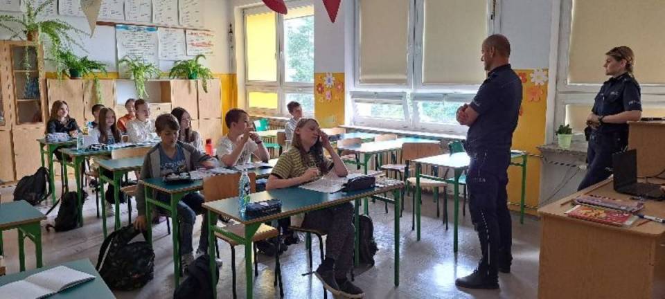 Uczniowie klas szóstych dodatkowo wysłuchali dzielnicowych o problemach jakie niesie ze sobą „świat internetowy". Podczas prelekcji ostrzegali jak niebezpieczne może być hejtowanie oraz nawiązywanie kontaktu z nieznajomymi. Wszystkim uczestnikom spotkania dzielnicowi życzyli udanych, pełnych pozytywnych wrażeń i przede wszystkim bezpiecznych wakacji.