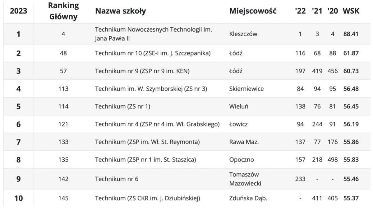 Nieco inaczej sprawa wygląda jeśli chodzi o szkoły średnie techniczne. Tutaj pierwsza dziesiątka to placówki z różnych stron województwa. Palmę pierwszeństwa bezkonkurencyjnie dzierży Technikum Nowoczesnych Technologii z niewielkiego Kleszczowa w powiecie bełchatowskim. Ta szkoła od kilku już lat jest w czołówce polskich techników na przemiennie zmieniając miejsce na podium. W ubiegłym roku w skali ogólnopolskiej zajmowała I miejsce, teraz spadła na IV. Poniżej, na fotografii pierwsza dziesiątka w Łódzkiem.
