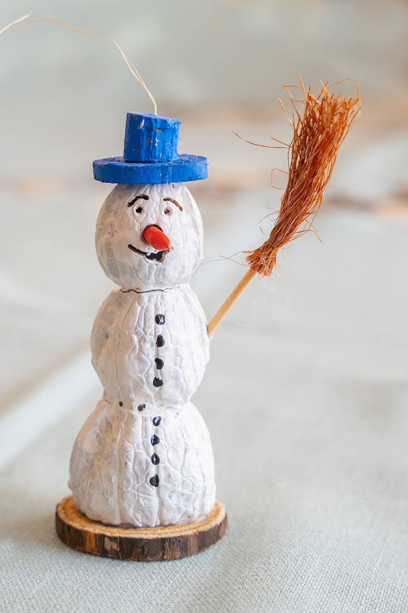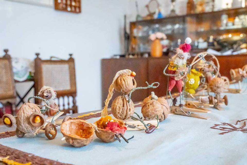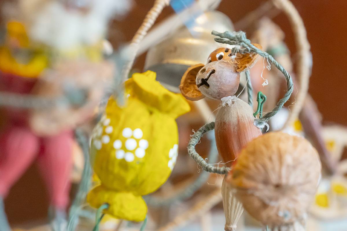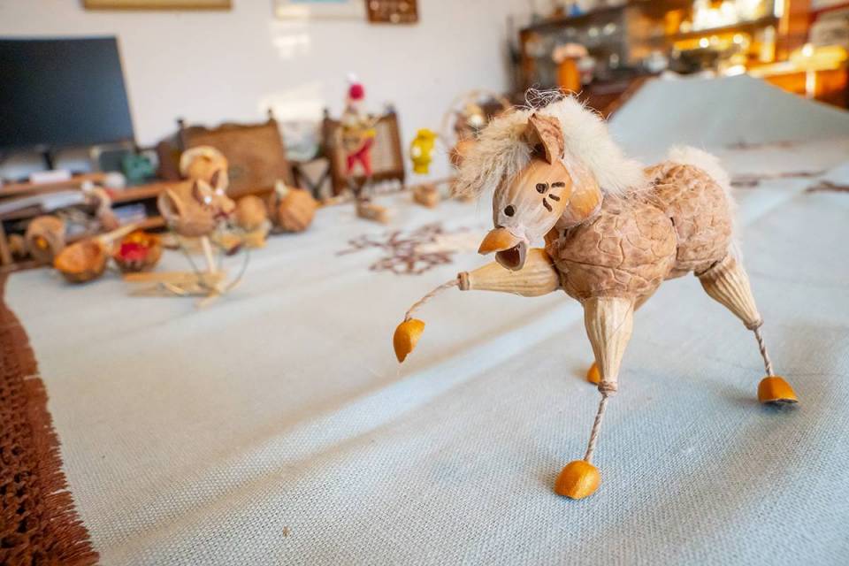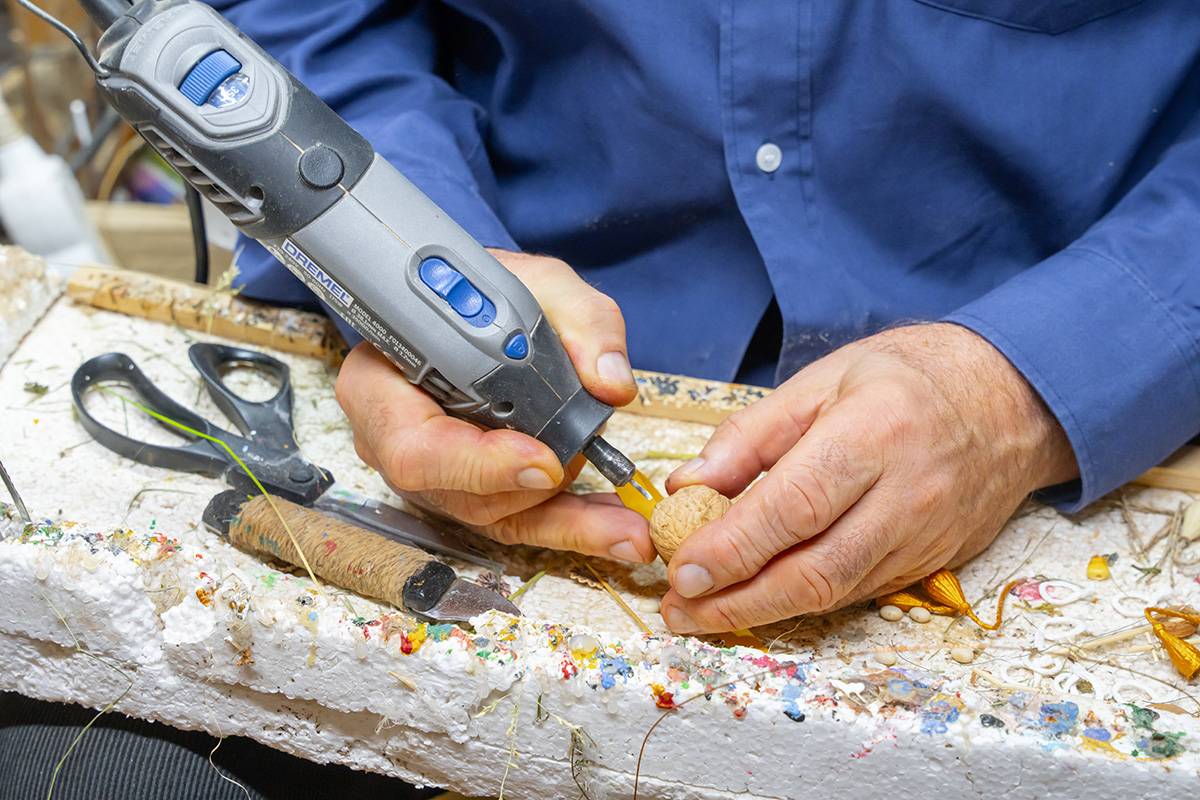Bazą do wykonania tych niezwykłych, mikroskopijnych ozdób są tylko naturalne materiały: łupiny orzechów, żołędzie, główki makówek, kawałki drewna, traw, kora, mech, ziarnka zbóż. Jak mówi sam artysta, wykorzystuje to, co innym może wydawać się bezwartościowe. Jego pracownia to prawdziwy magazyn m.in. łupinek po orzechach włoskich, które ma w swoim ogrodzie, ale i które przynoszą mu ludzie. Pan Mariusz potrafi z nich wyczarować praktycznie wszystko – orzech może być dzikiem, pszczółką Mają, konikiem na biegunach, brzuchem Mikołaja, kulami bałwanka czy wózkiem dla malutkiej małpki. Każda ozdoba zachwyca precyzją wykonania i niewiarygodną fantazją autora. Figurki grają na instrumentach, wspinają się po linach, jeżdżą na wózeczkach.
