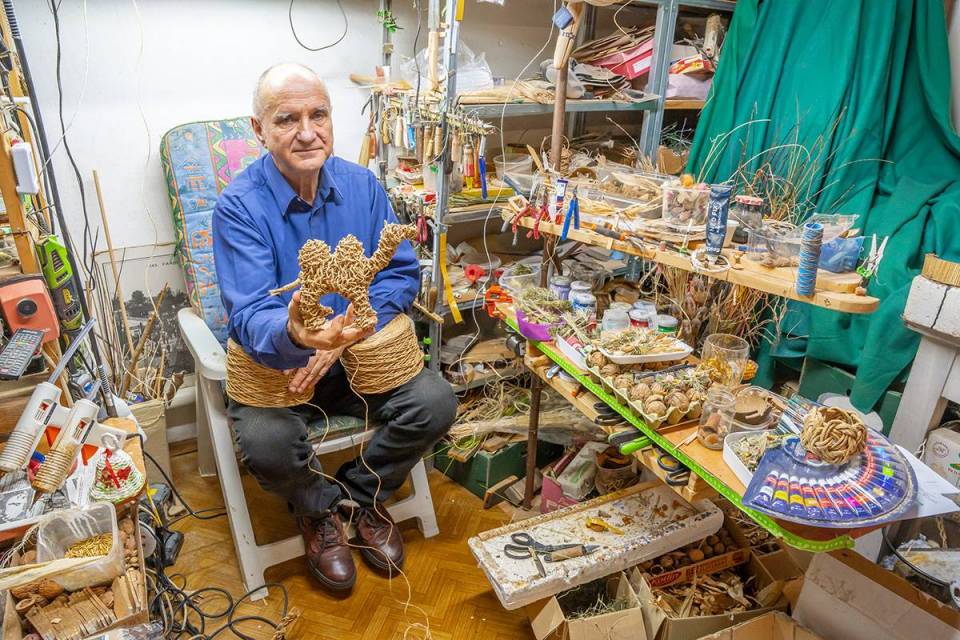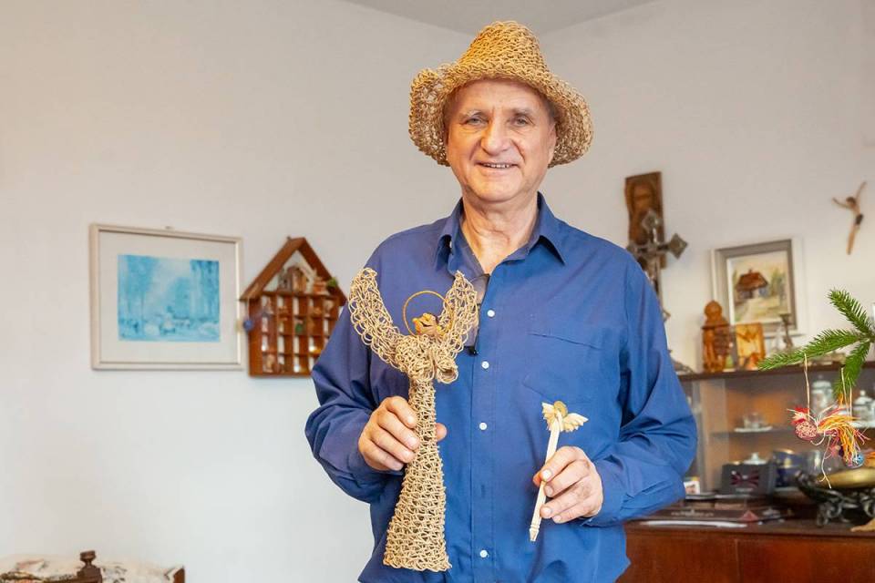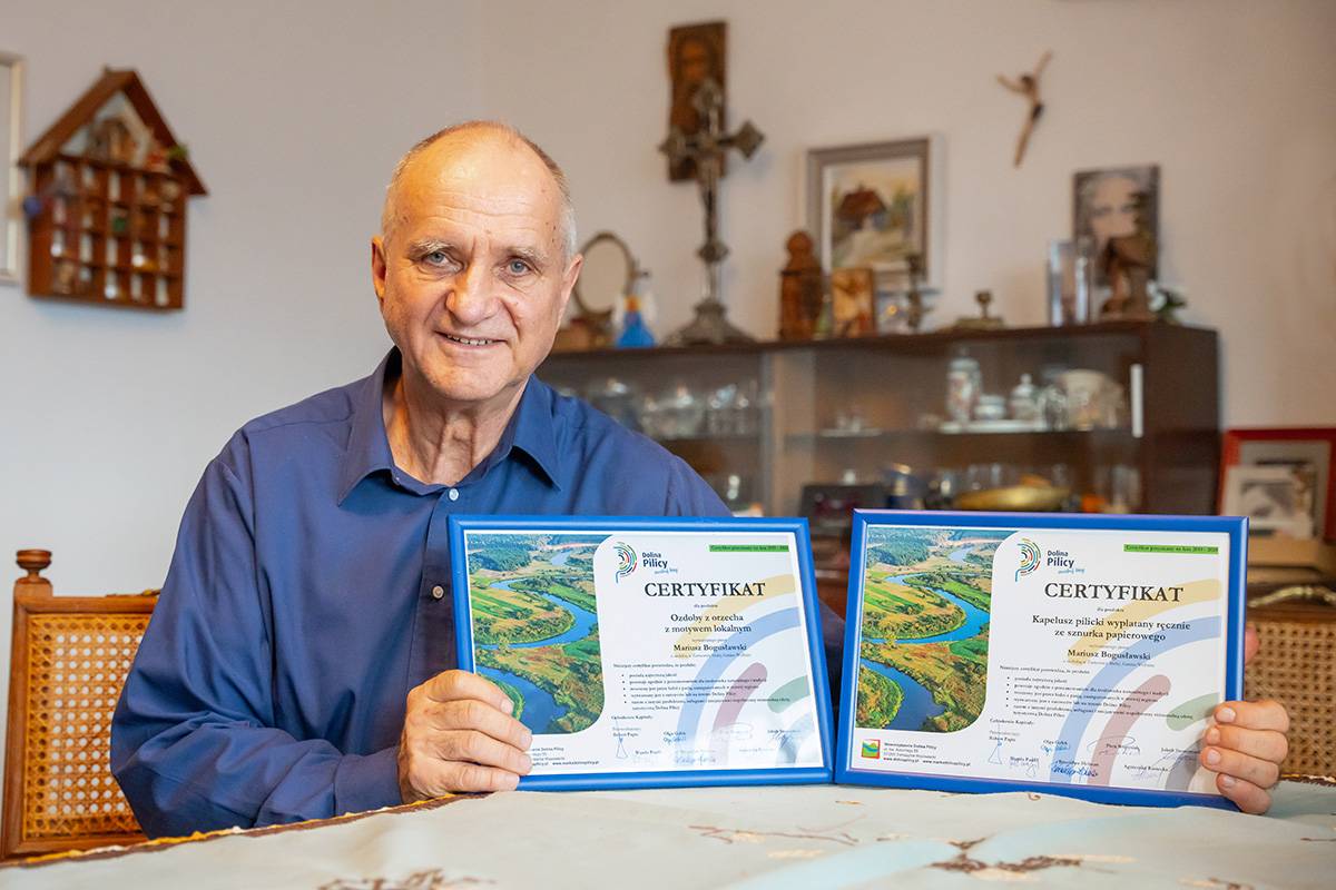 Na jego stoisku oprócz mikroskopijnych szopek i orzechowych dekoracji oraz zabawek, można znaleźć plecionki. Już nie kompozycje z suchymi kwiatami, ale wszystko, co podpowie wyobraźnia. Ze sznurka papierowego tworzy sztukę użytkową – plecaki, torby oraz kapelusze z najsłynniejszym, czyli kapeluszem Pilickim, regionalnym produktem z certyfikatem marki Dolina Pilicy Zwolnij Bieg. Ale są i cylindry, jest kapelusz czarodzieja, pleciony hełm strażacki czy czapka czołgisty.